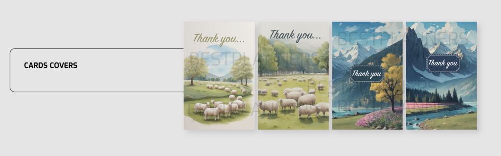 You'll get a zip file containing 5 PNG files. The PNG files are 4 card covers and 1 inside page.