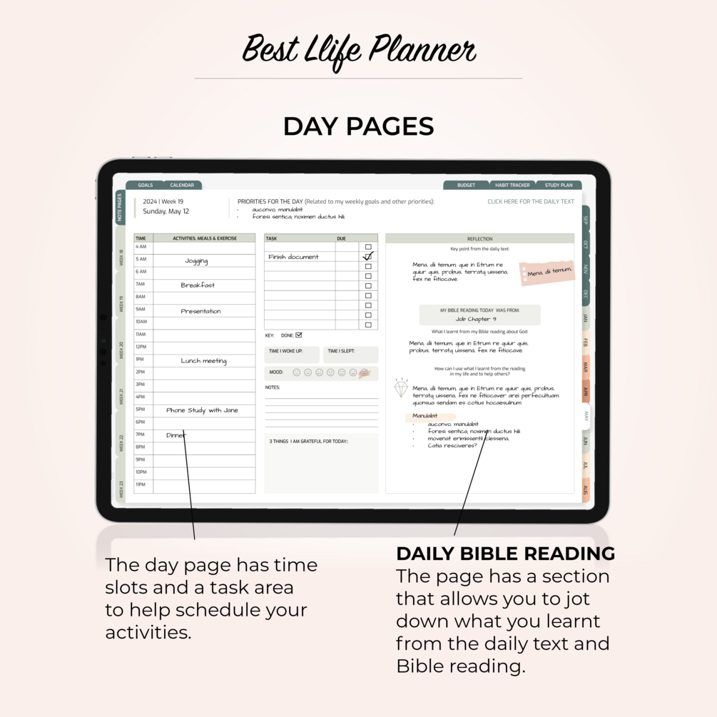 π‘ Put spirituality first: The daily text is accessible on each page. The link opens Watchtower Online Library. Each day page has space for writing down reflection on the daily text and Bible reading. Public Talk note pages are available on each week page.